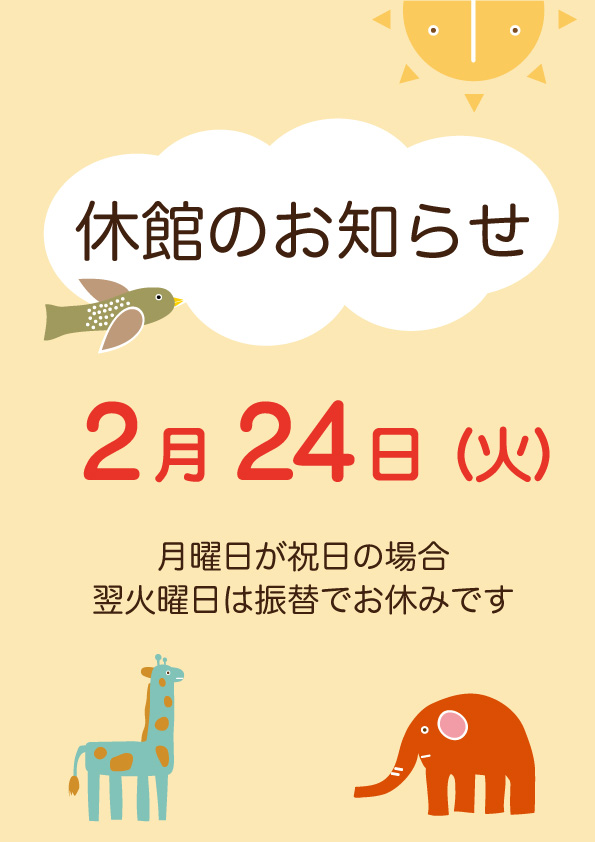 2/24(火)休館のお知らせ 公開済み: 2026年2月21日更新: 2026年2月21日作成者: popolaカテゴリー: お知らせ << 2026年2月 ポポラ・ポポラサテライトは、 月曜日が祝日の場合、翌火曜日も振替で休館となります。 2/24(火)は休館となりますので、どうぞよろしくお願い致します。