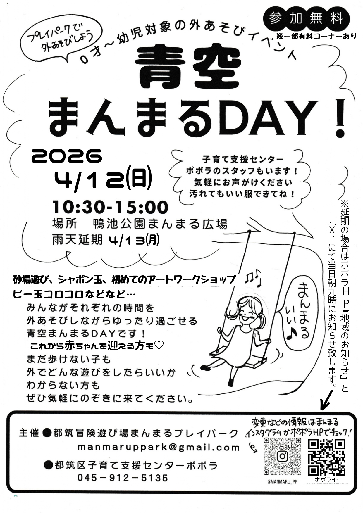 みんながそれぞれ”外あそび”をしながらゆったり過ごせる「青空まんまるDAY」開催します。