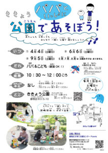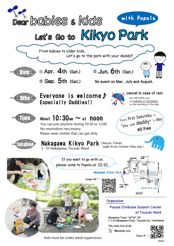 3/26 (木)「ききょう公園であそぼう!」中止のお知らせ 公開済み: 2026年3月26日更新: 2026年3月26日作成者: popolaカテゴリー: お知らせ, 未分類 << 2026年3月 3/26(木)「ききょう公園であそぼう!」 は、雨ため中止となりました。 次回の公園あそびは以下の通りです。楽しみにしていてね~。 パパききょう4月~ Kikyo Park(“play with daddy” ‘s day) ききょう2026年3月~ KikyoPark2026_Mar.~