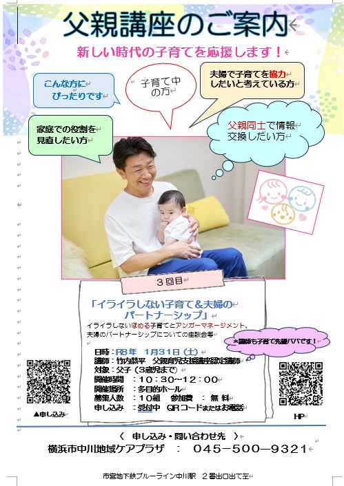 中川地域ケアプラザで「父親講座 第3弾」開催します。